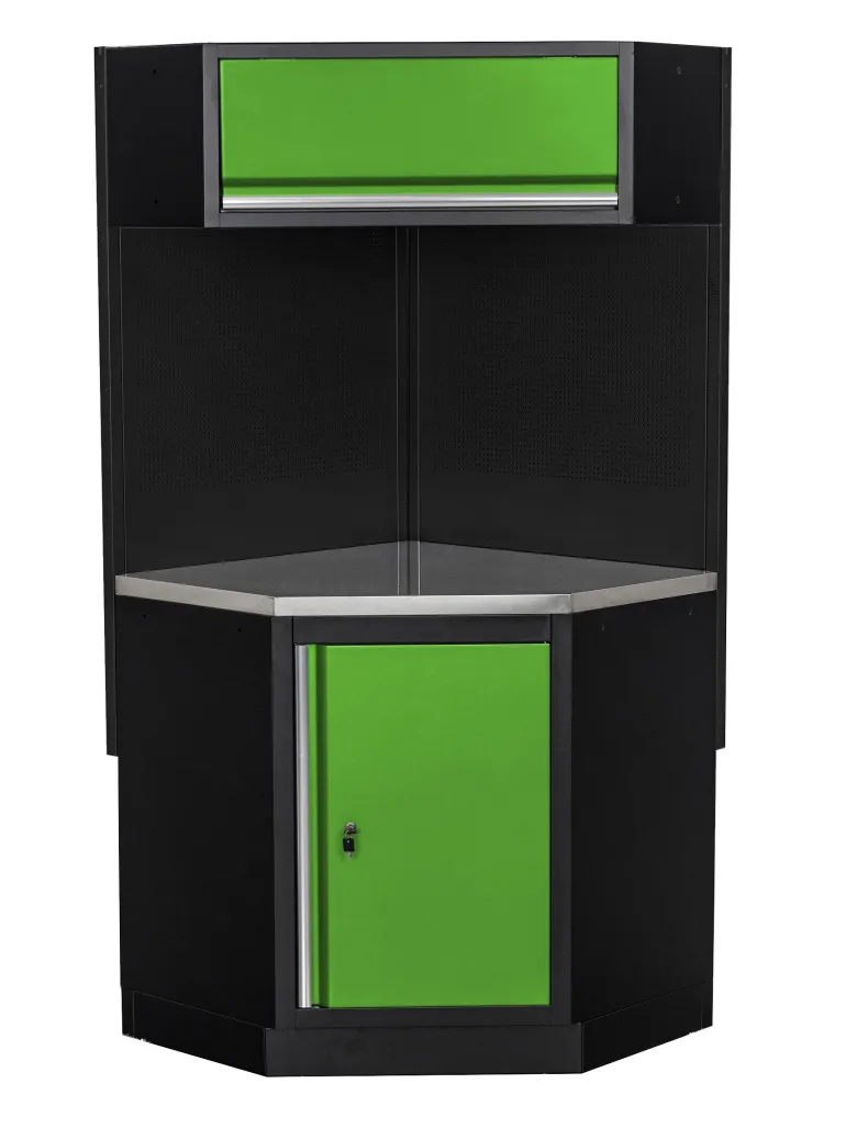 PELA vihreä/musta autotallikalusteen kulmaosa, joka koostuu ala- ja yläkaapista, ruostumattomasta teräksestä valmistetusta työtasosta ja kahdesta työkalutaulusta. Lähin vihreän värikoodi on RAL 6018.