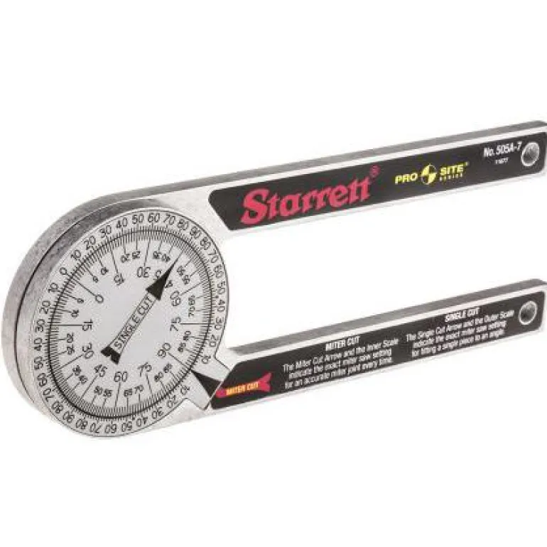 Starrett 505A-7 on kulmamitta jiirauskulmille. Kaksi skaalaa ja nuolta. Punainen skaala ja nuoli kertovat, miten jiirisahan kulma pitää asettaa ennen leikkausta. Musta skaala ja nuoli