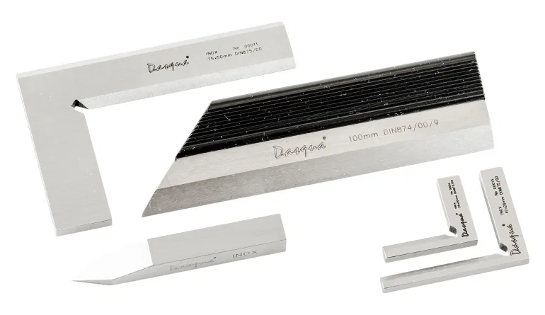 Dasqua 495203 on viisiosainen mittatyökalusarja ruostumattomasta teräksestä mattakromatulla pinnalla. Sarja sisältää 3 kappaletta viistokulmaimia (DIN 875/00) mitoilla 25 x 20 mm, 40 x 28 mm ja 75 x 50 mm, yhden 100 mm:in hiusviivaimen (DIN 874/00) sekä yhden piirtokärjen mitoilla 60x8x8 mm.