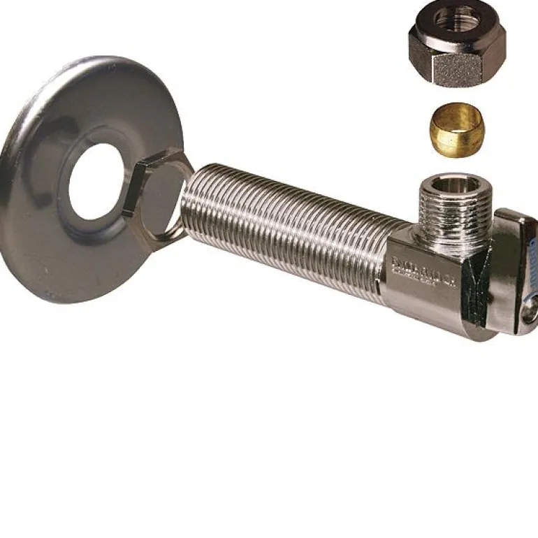 Kulmanippa sinkkikadon kestävästä messingistä, liitäntä 10 mm hehkutettuihin kupariputkiin. Käytetään WC-istuimen tai pesuallashanan liittämiseen. Toimitus sisältää peitelevyn Ø 70 mm, tiivisteen ja vastamutterin.