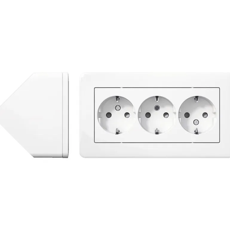 Kulmarasia, jossa kolme maadoitettua 16 A:n pistorasiaa. Kosketussuojattu. Pinta-asennukseen esimerkiksi keittiön alakaappeihin tai kulmiin. Mukana kulmarasia ja kehys.