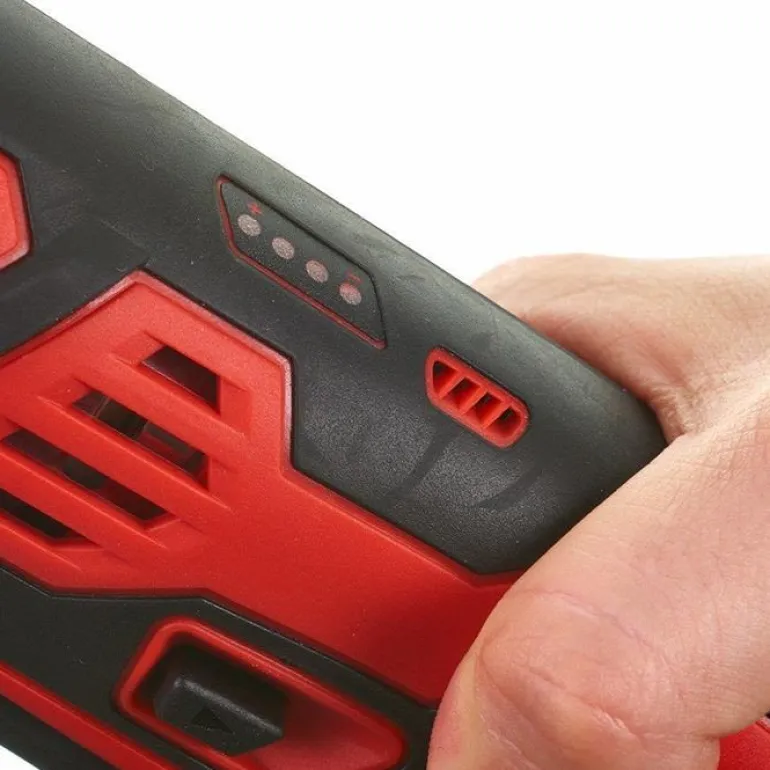 Kulmaruuvinväännin, 12 V, kuusiokantaistukka 1/4″. Laitteen iskuluku on 0–3300 kierrosta minuutissa ja kierrosluku 0-2425 kierrosta minuutissa, suurin vääntömomentti 68 Nm.