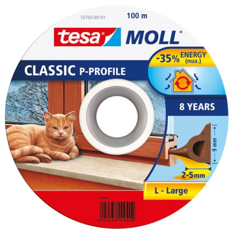 Tesa P-list 55703-00101-00 on P-profiilinen itsekiinnittyvä vedolta suojaava tiivistenauha. Ajan mittaan ikkunankehyksiin syntyy välystä, eivätkä ne enää estä luotettavasti kylmän ilman pääsyä sisään, kun tuulenpuuskat osuvat niihin. Tesa P-list 55703-00101-00 on itsekiinnittyvä tiivistenauha, joka tiivistää erityisesti vanhoille ikkunoille tyypilliset piilevät raot. Se on tehokas, ikkunankarmiin kiinnitettävä tiiviste, joka kestää pitkään ja voi säästää energiakustannuksia jopa 35 %. Helposti kiinnitettävän, taataan toimivan vähintään 8 vuotta.