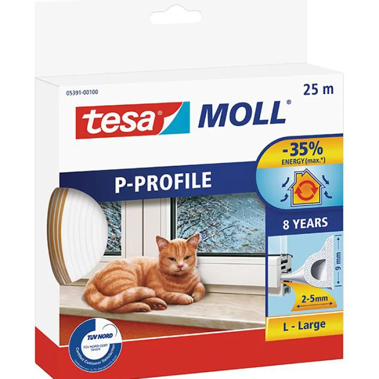 Tesa P-list 05391-00100-00 on P-profiilinen itsekiinnittyvä vedolta suojaava tiivistenauha. Ajan mittaan ikkunankehyksiin syntyy välystä, eivätkä ne enää estä luotettavasti kylmän ilman pääsyä sisään, kun tuulenpuuskat osuvat niihin. Tesa P-list 05391-00100-00 on itsekiinnittyvä tiivistenauha, joka tiivistää erityisesti vanhoille ikkunoille tyypilliset piilevät raot. Se on tehokas, ikkunankarmiin kiinnitettävä tiiviste, joka kestää pitkään ja voi säästää energiakustannuksia jopa 35 %. Helposti kiinnitettävän, taataan toimivan vähintään 8 vuotta.