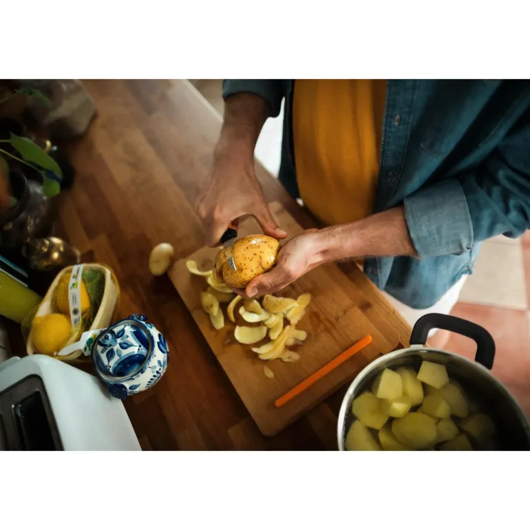 Kompakti veitsi, jossa on kaareva terä pyöreiden juuresten ja hedelmien tarkkaan kuorintaan. Veitsenterä on valmistettu kestävästä japanilaisesta ruostumattomasta teräksestä. Ergonomisesti suunnitellussa kahvassa on hyvin asennettu sormensuojus. Konepesunkestävä.