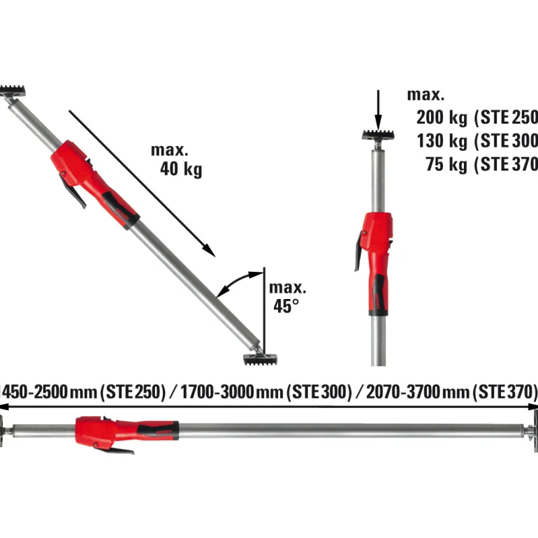 Bessey STE250 on 1450–2500 mm:n kuormatuki, jossa on pumppukahva, kuormitusvoima enint. 200 kg. Todella vakaa rakenne ylä- ja alaosan PVC-liitäntäelementtien ansiosta. Bessey STE250 -kuormatukea voi käyttää myös kaltevilla tasoilla kääntyvän pään ansiosta välillä -45° -> +45°.