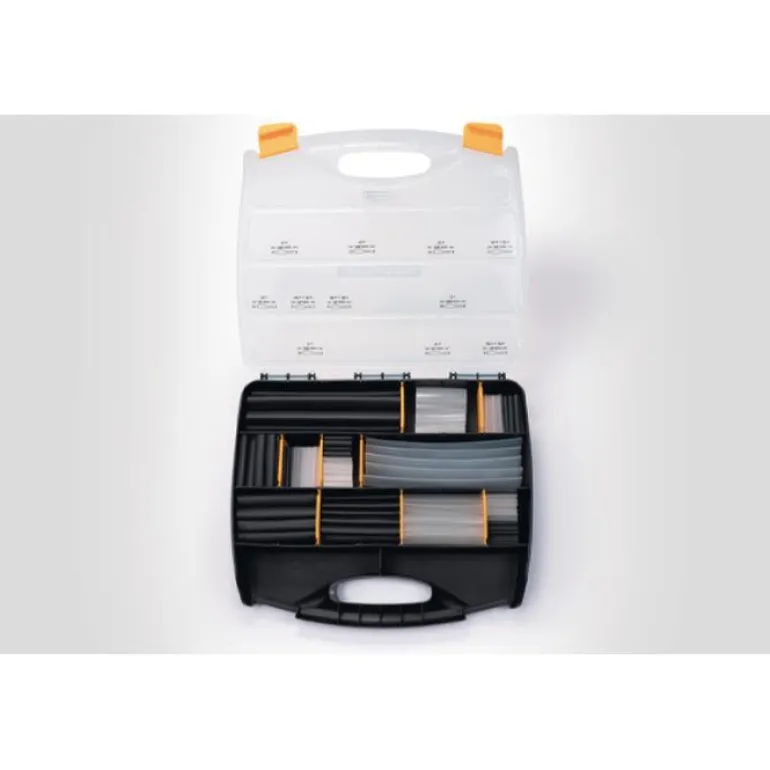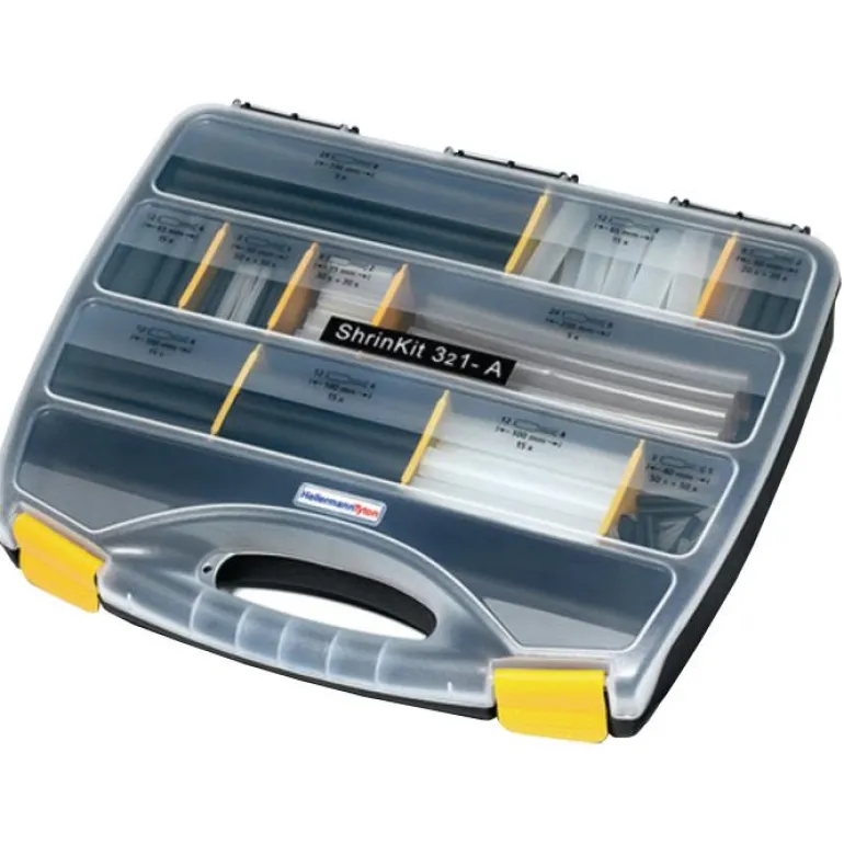 Hellermann Tyton ShrinKit 321-A on hyvin varustettu 210-osainen lajitelmalaatikko, joka sisältää laajan valikoiman eri pituisia kutisteletkuja. Neljää eri kokoa, mustana ja läpinäkyvänä.