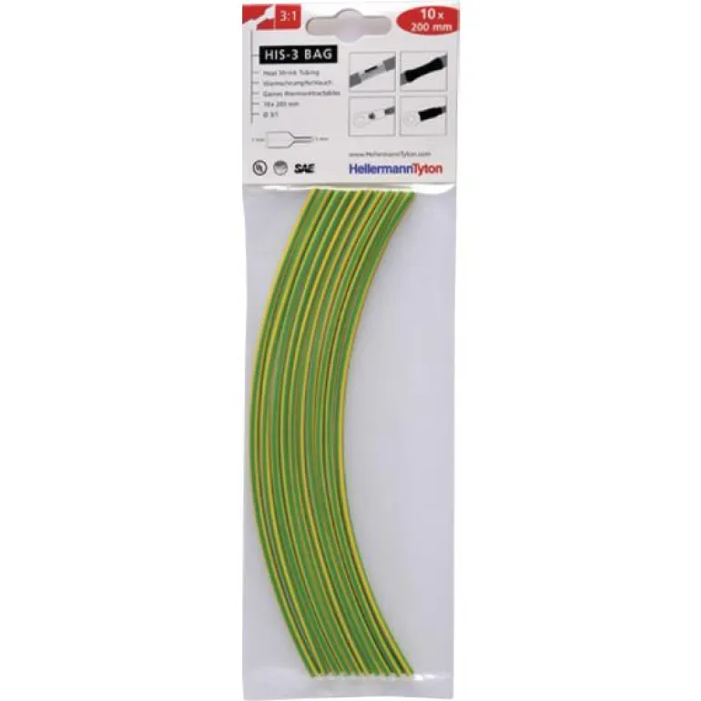 Hellermann Tyton HIS-3 Bag sisältää 3/1 mm:n keltaisia/vihreitä kutisteletkuja, jotka soveltuvat eristykseen ja kaapelien sekä liitinten suojaamiseen. Ohutseinäinen ja taipuisa letku, joka on valmistettu ristisilloitetusta polyolefiinista. Pakkaus sisältää 10 määrämittaisia kutisteletkua, joiden pituus on 200 mm.