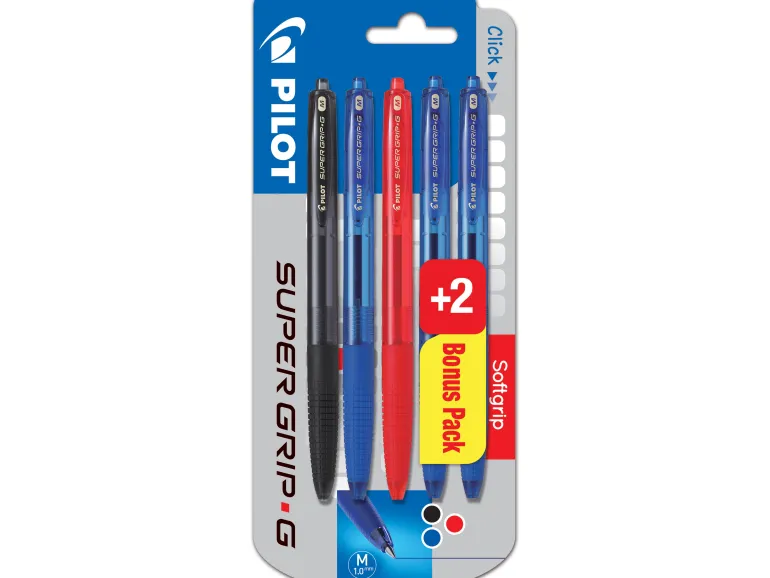 Pilot Super Grip G on kuulakärkikynä öljypohjaisella musteella ja kumipäällysteellä, joka antaa hyvän kirjoitustuntuman. Kynässä on 1 mm leveä kärki, ja se toimitetaan 5 kappaleen pakkauksessa (kolme sinistä, yksi musta ja yksi punainen).