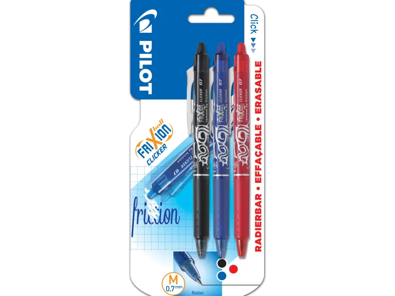 Pilot FriXion Ball Clicker on kuulakynä innovatiivisella lämpöherkällä pyyhittävällä musteella, jonka avulla voit kirjoittaa ja pyyhkiä niin monta kertaa kuin haluat. Muste on pehmeää ja miellyttävää, tarjoten erinomaisen kirjoitustuntuman. Kynässä on 0,7 mm leveä kärki ja tuote sisältää 3 kpl kyniä (värit musta, punainen ja sininen).