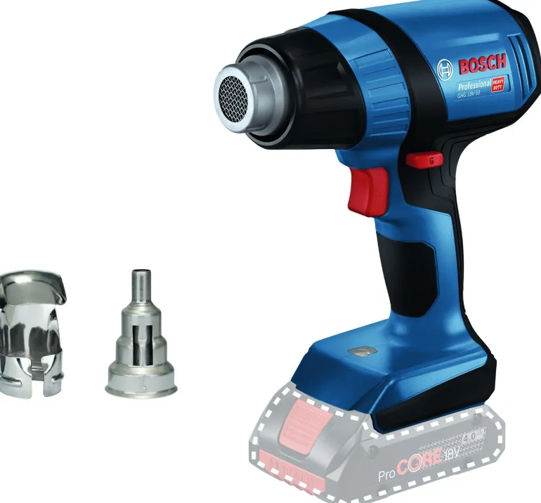 Bosch GHG 18V-50 Professional on akkukäyttöinen kuumailmapuhallin, joka on tarkoitettu joustavaan käyttöön jokaisessa työkohteessa. Vain kuudessa sekunnissa 300 °C:een lämpenevä akkukäyttöinen kuumailmapuhallin takaa nopean työskentelyn. Mukana kannettava ja kätevä GHG 18V-50 sopii jokaiseen työkohteeseen ja sitä voi käyttää myös sellaisilla rakennustyömailla, joihin ei ole vielä vedetty sähköjä. Kahdella 300 °C:n ja 500 °C:n lämpötilaportaalla sekä LED-valolla varustettu kuumailmapuhallin on aina uskomattoman helppokäyttöinen. GHG 18V-50 Professional soveltuu mitä erilaisimpiin tehtäviin, esimerkiksi letkujen kutistamiseen. Se on yhteensopiva johdollisten kuumailmapuhaltimiemme koko suutinvalikoiman sekä kaikkien Bosch Professional 18 V:n akkujen ja latauslaitteiden kanssa (Professional 18V System). Kun haluat suurimman tehon, valitse ProCORE18V ≥ 4,0 Ah. Yhteensopiva myös monimerkkisen AMPShare-akkuliittoutuman kanssa.