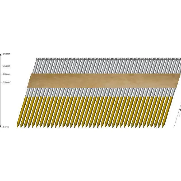Kuumasinkitty naula. Läpimitta 2,8 mm ja naulan pituus 75mm, 17°:n runkonaulaimelle. Määrä: 500 kpl