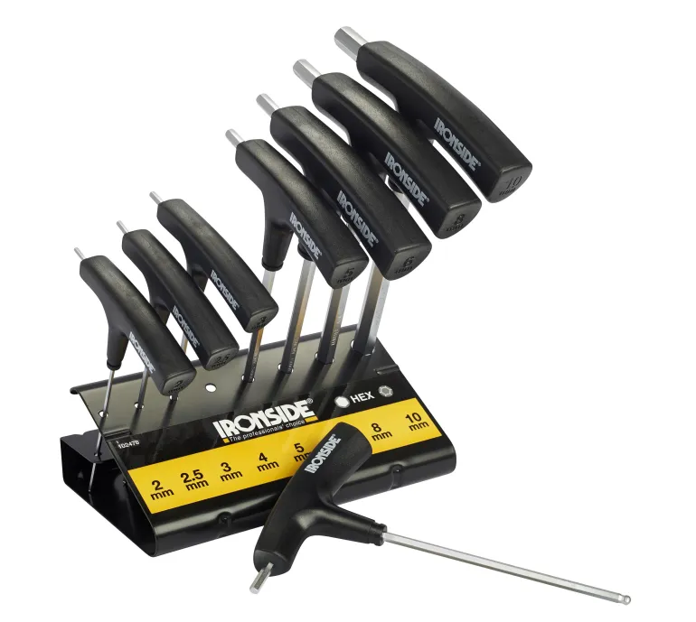 Sarja, jossa on 8 kuusiokoloavainta, joissa on T-kahva. Sisältää: 2, 2,5, 3, 4, 5, 6, 8, 10 mm. Terä nikkelöityä kromivanadiiniterästä. Kuula pitkässä päässä. Sama ulottuvuus molemmissa päissä.