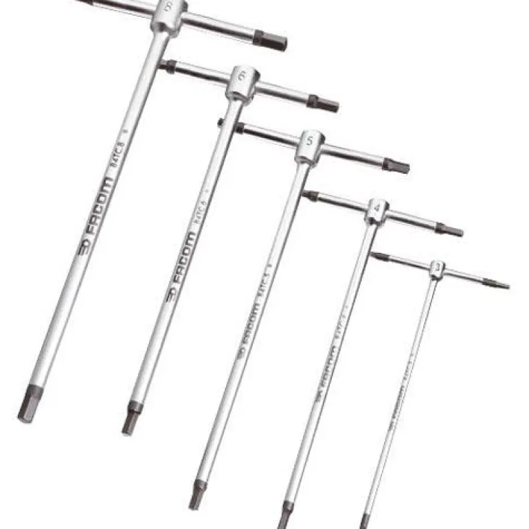 Facom 84TC.JE5 on kuusiokoloavainsarja T-kahvalla. Sarja on jaettu viiteen osaan, ja se sisältää erikokoisia avaimia. Kuusiokoloavaimissa on kuusikulmainen profiili kolmessa päässä. Avaimet ovat kromattuja, ja päät ovat mustat.