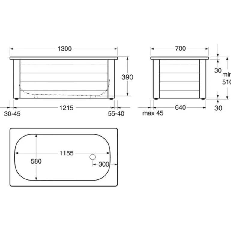 Kylpyamme yhdelle henkilölle. Muoto suorakulmio ja emaloitu pinta. Mitat 1300 x 700 x 510 mm (P x L x K). Syvyys 390 mm.