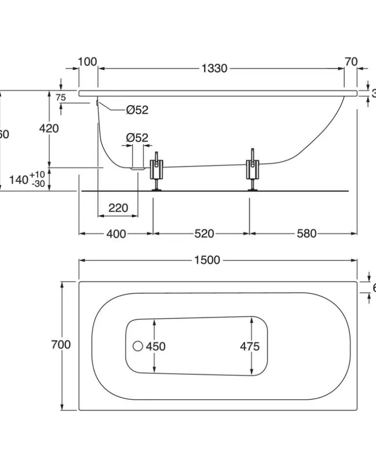 Gustavsbergin valkoinen sisäänrakennettava kylpyamme korkealaatuisesta emaloidusta titaaniseosteräksestä. Kylpyammeessa on tilava pääpääty kylpyä ja jalkapääty suihkua varten.