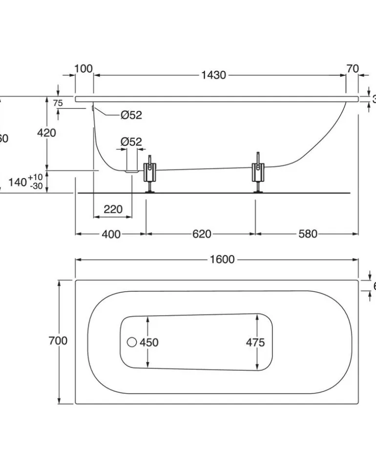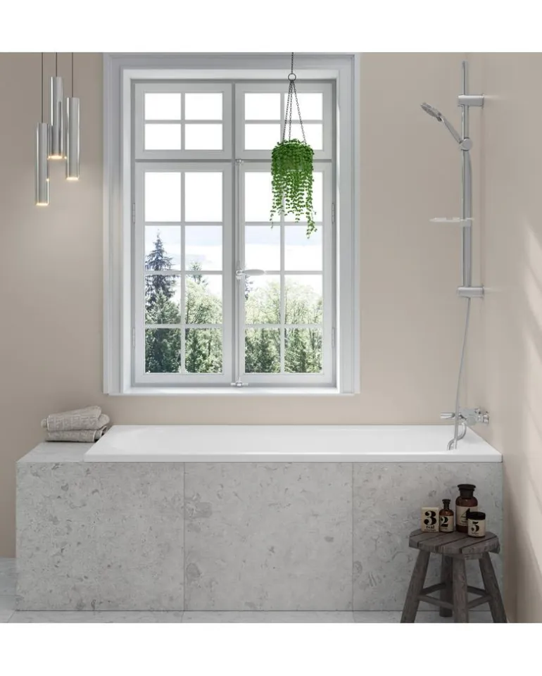 Gustavsbergin valkoinen sisäänrakennettava kylpyamme korkealaatuisesta emaloidusta titaaniseosteräksestä. Kylpyammeessa on tilava pääpääty kylpyä ja jalkapääty suihkua varten.