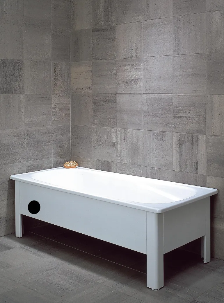 Svedbergs 12035 -emalikylpyamme. 130 x 70 x 38,5 cm, valkoinen. Huom. Myydään ilman etu- ja sivupaneelia.