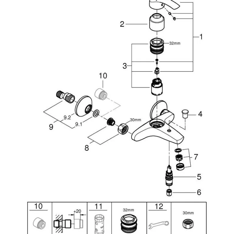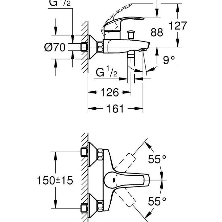 Yksikahvainen hana ammeeseen ja suihkuun DN 15 -seinäasennuksella. Metallikahvalla varustettu, GROHE SilkMove® 35 mm:n keraaminen säätöosa lämpötilarajoittimella ja säädettävällä virtauksen rajoittimella.