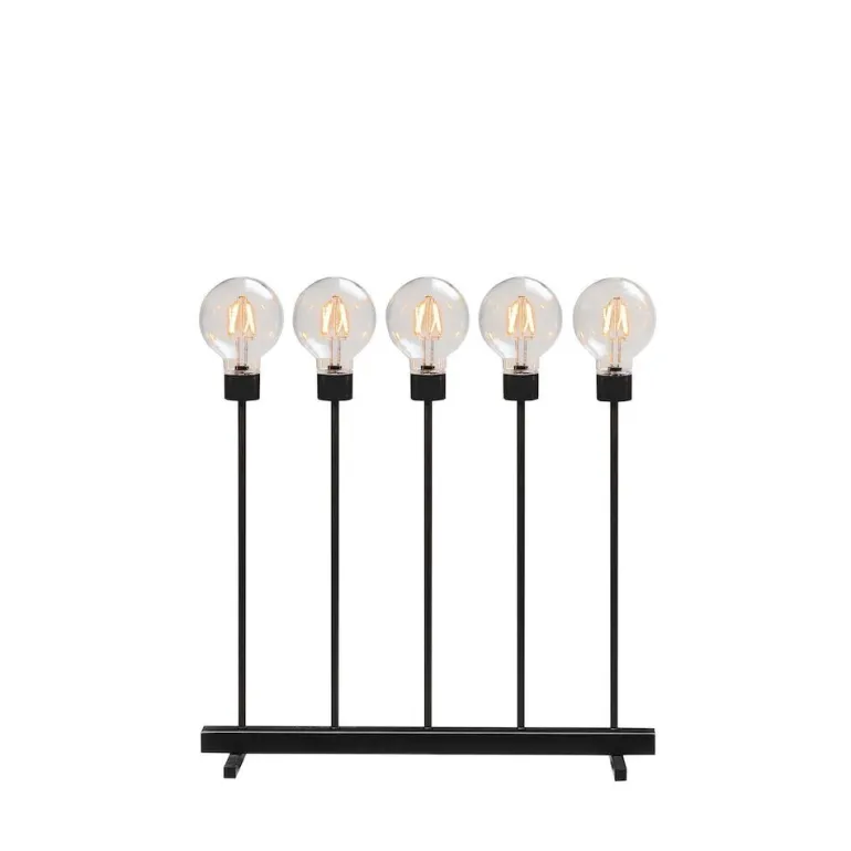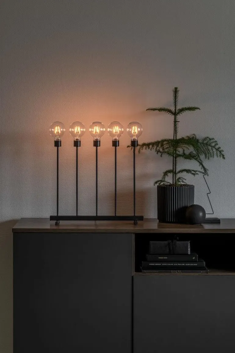 Kynttelikkö, jossa viisi suurta valonlähdettä vaihdettavilla LED-valoilla. Virtalähde 24 voltin muuntaja.