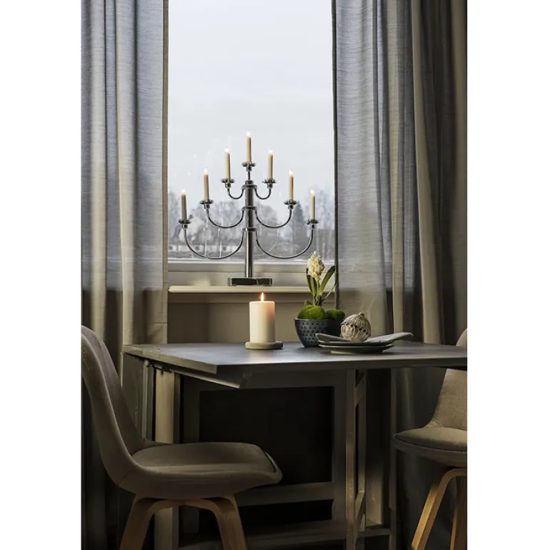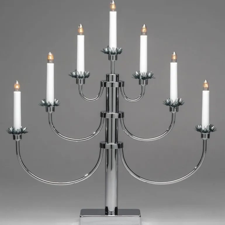 12,6W:n metallinen kromikynttilänjalka. Kynttelikössä on 7 valopistettä ja 6 luumenin kirkkaus. Mukana 240 cm:n pituinen johto, jossa on kytkin.