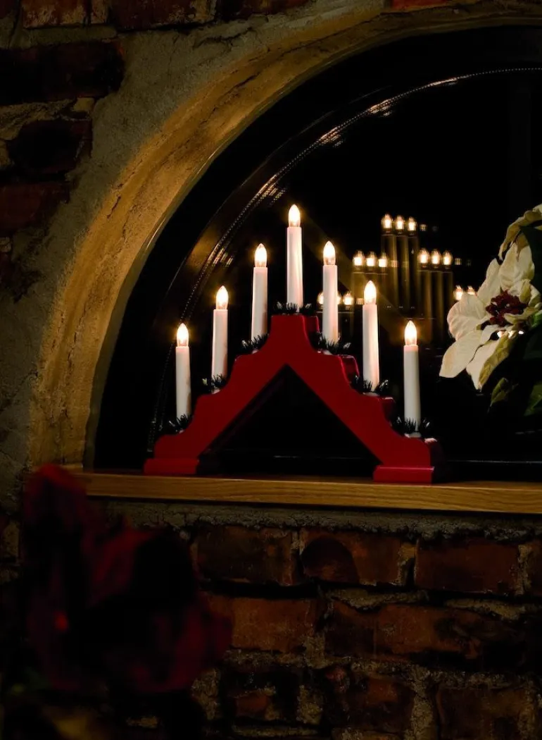 Klassinen punaiseksi maalattu puinen sähkökynttelikkö, jossa on 7 valopistettä. Sähkökynttelikön kirkkaus on 6 luumenia, ja se on varustettu valkoisella 170 cm:n pituisella johdolla, jossa on kytkin.