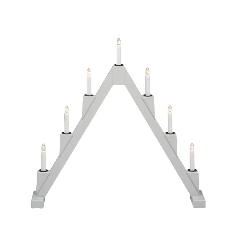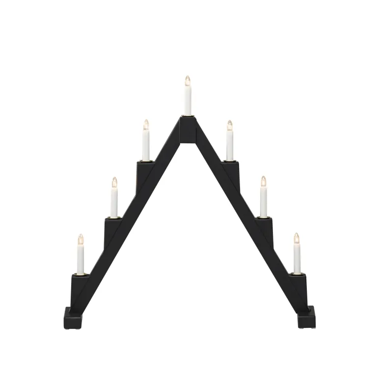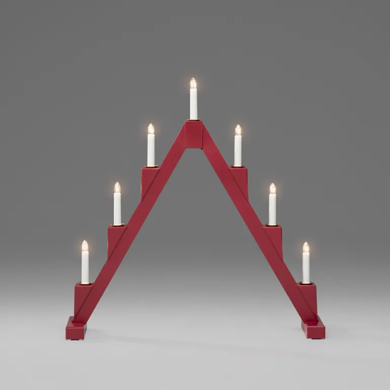 Konstsmide 3590-510 on puinen kokoontaitettava sähkökynttelikkö 7 kynttilällä. Väri punainen ja messinkiset koristerenkaat.