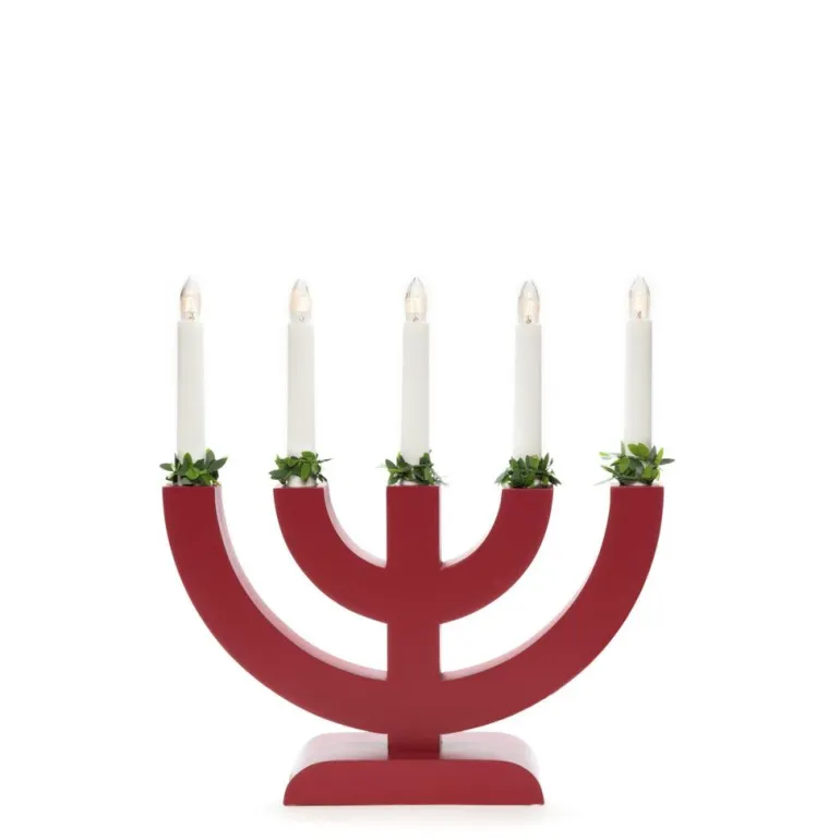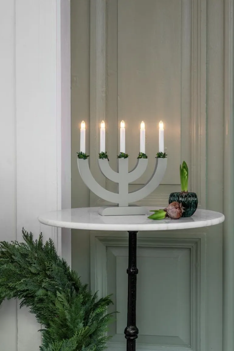 Konstsmide 3988-319 on puinen sähkökynttelikkö 5 kynttilällä. Harmaa vihreillä manseteilla. 230V/IP20.