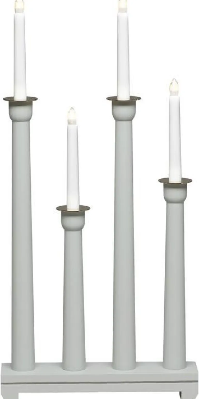 Konstsmide 3977-310 on puinen sähkökynttelikkö 4 kynttilällä. Harmaa, koristerenkaat messingistä. 230 V/IP20.