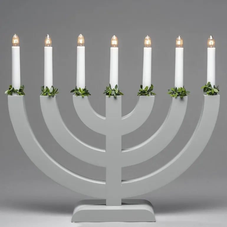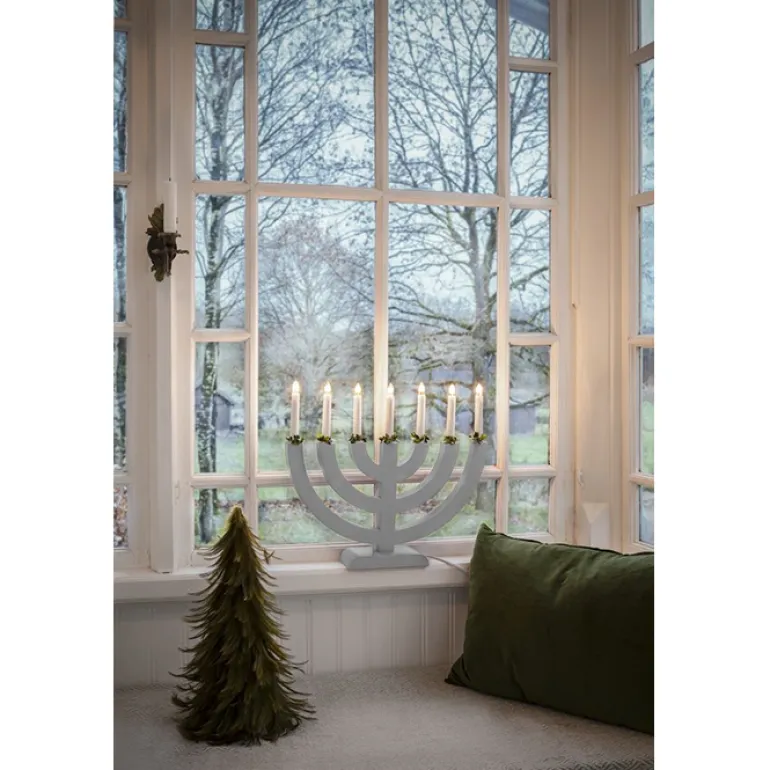 21W:n harmaa sähkökynttilänjalka, jossa on 7 valopistettä. Kynttelikössä on vihreät koristeet. Kynttelikön johto on 170 cm pitkä, ja siinä on kytkin.