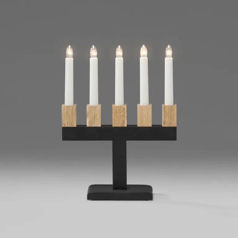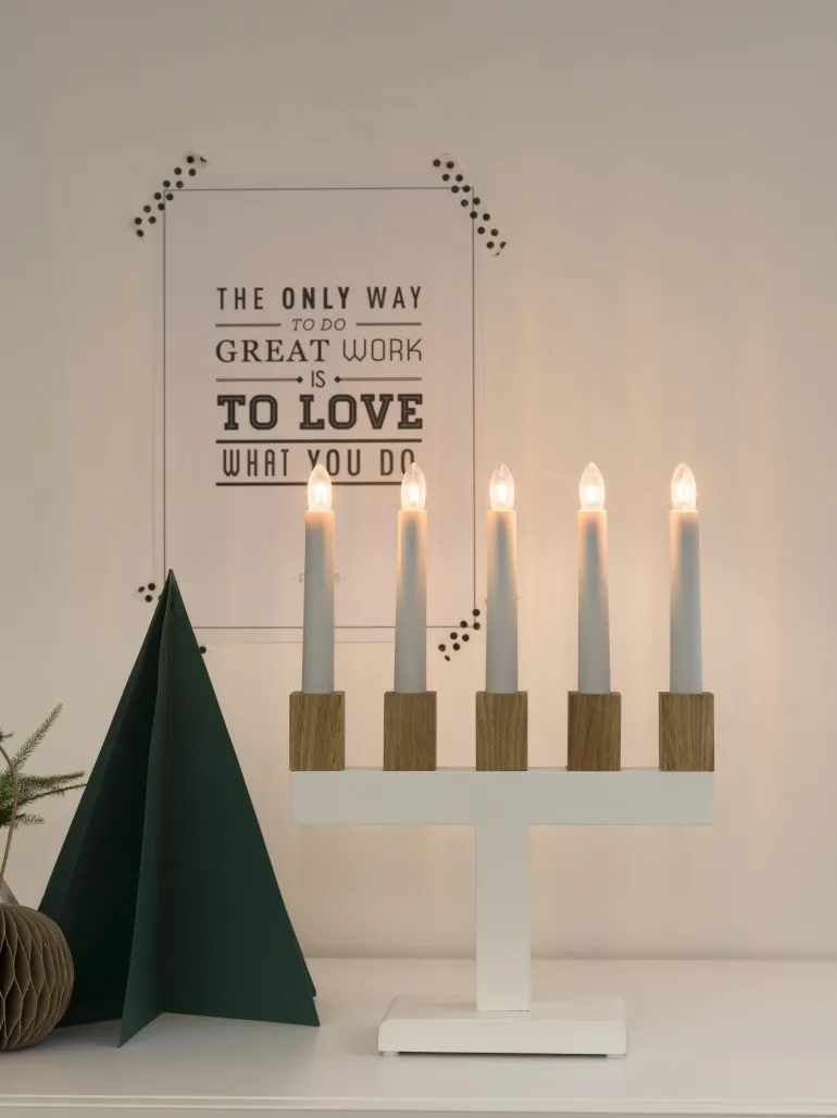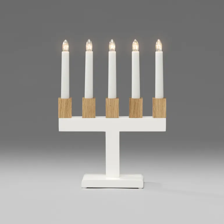Konstsmide 2558-201 on puinen sähkökynttelikkö 5 kynttilällä (tammi/valkoinen). 230 V.