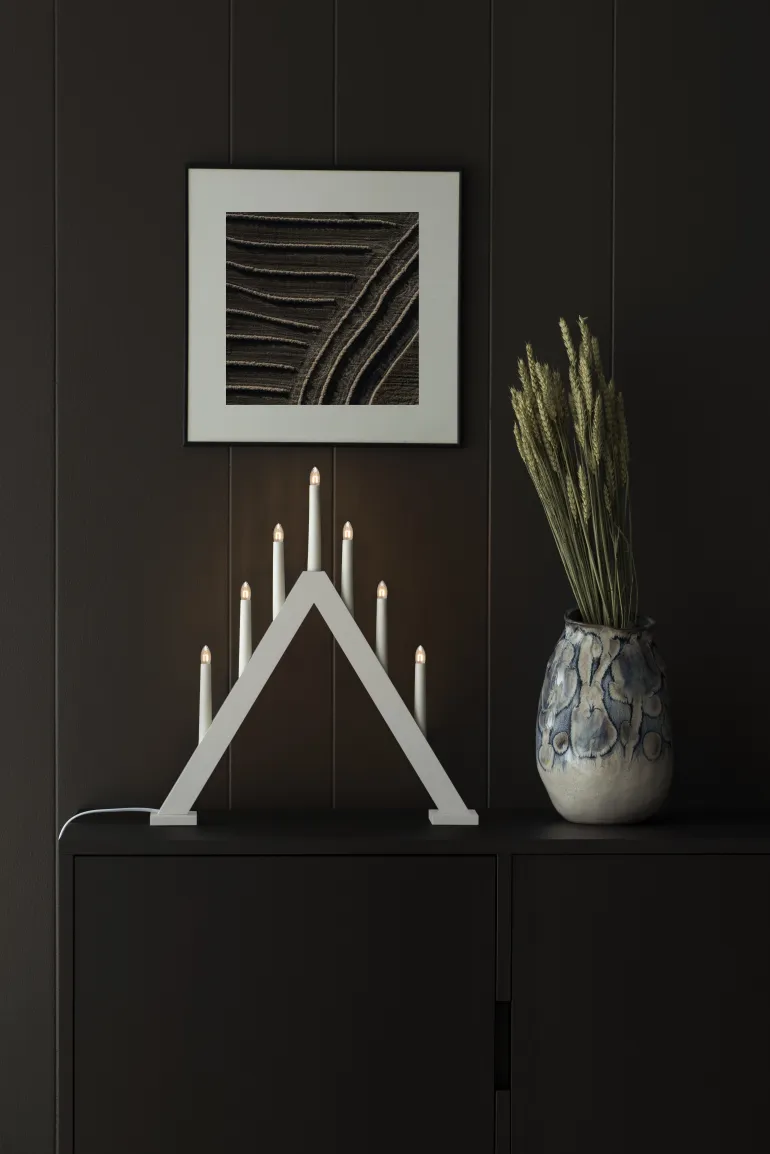 Konstsmide 3931-205 on puinen sähkökynttelikkö 7 kynttilällä. Valkoinen (matta). Kytkimellä, 230 V / IP20.