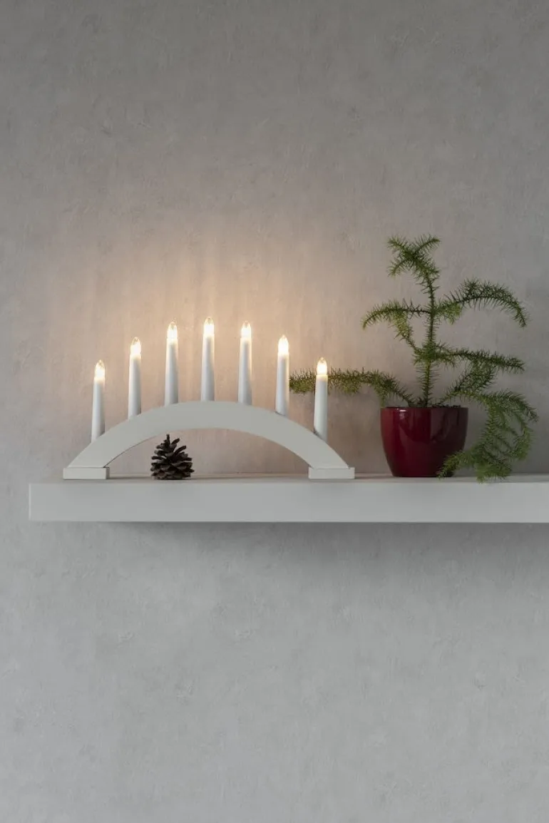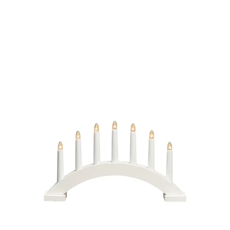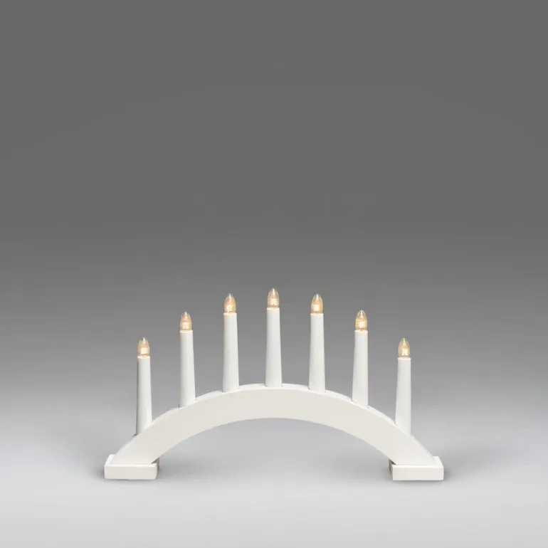 Valkoiseksi maalattu puinen sähkökynttelikkö, jossa on 7 valopistettä. Sähkökynttelikön valovirta on 8 luumenia, ja se on varustettu valkoisella 170 cm:n pituisella johdolla, jossa on kytkin.