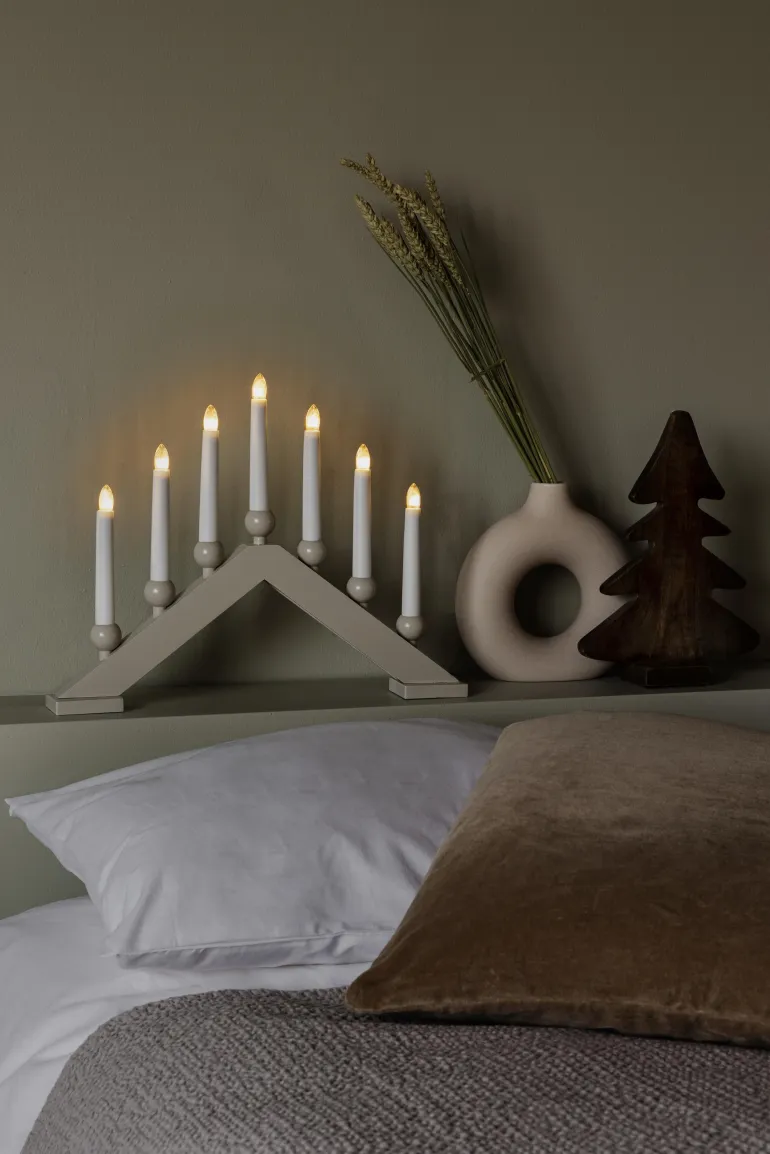Konstsmide 3935-975 on puinen sähkökynttelikkö, jossa on 7 kynttilää. Beige (matta). Kytkimellä, 230V/IP20.