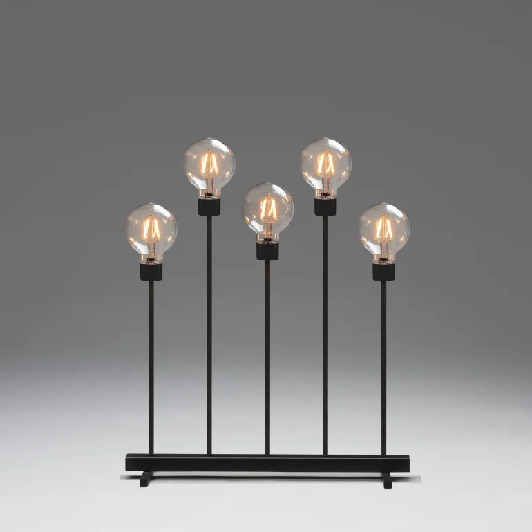 Konstsmide 3963-710TR on musta sähkökynttelikkö 5 kynttilällä, metallia. LED (valon väri amber), himmentimellä. 24 V/IP20.