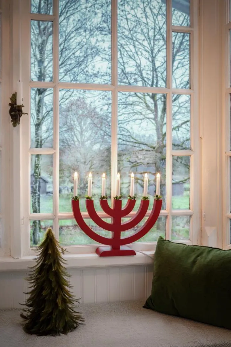 Konstsmide 3987-519 on puinen sähkökynttelikkö 7 kynttilällä. Punainen vihreillä manseteilla, 230V / IP20.