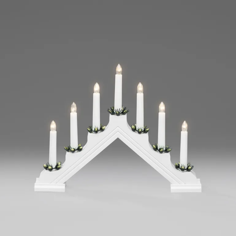 Konstsmide 2310-510 on sähkökynttelikkö klassisella muotoilulla. 7 kynttilää, materiaali muovi ja koristerenkaat (mänty). Väri punainen. Johto 170 cm kytkimellä, IP20/230 V.