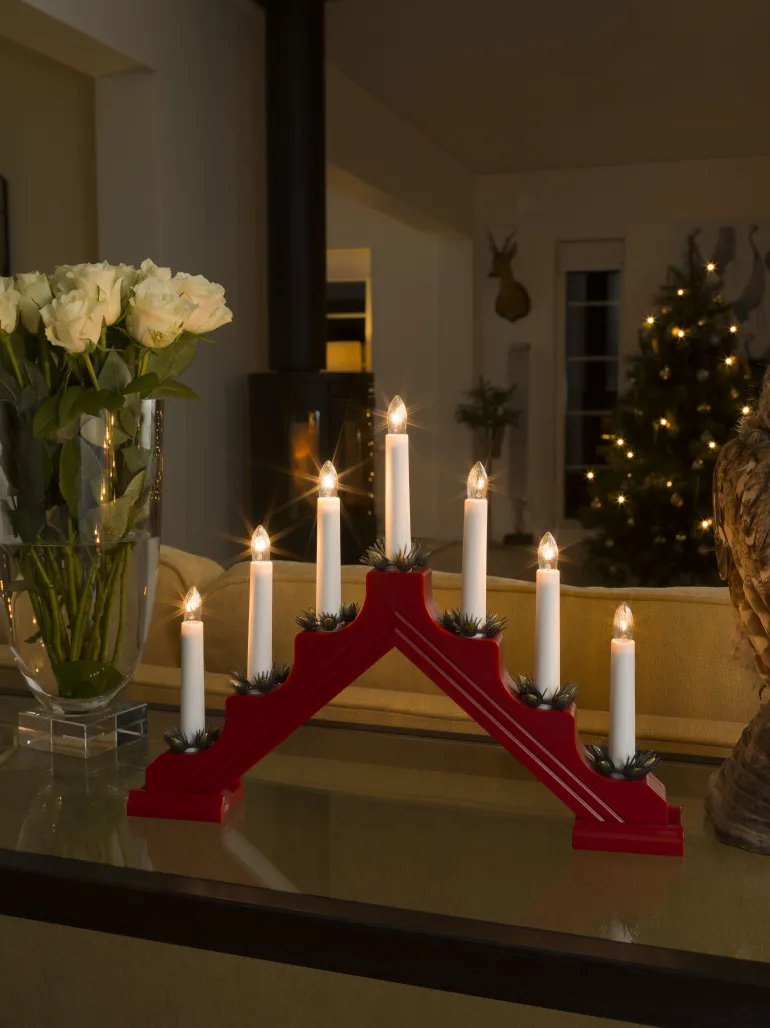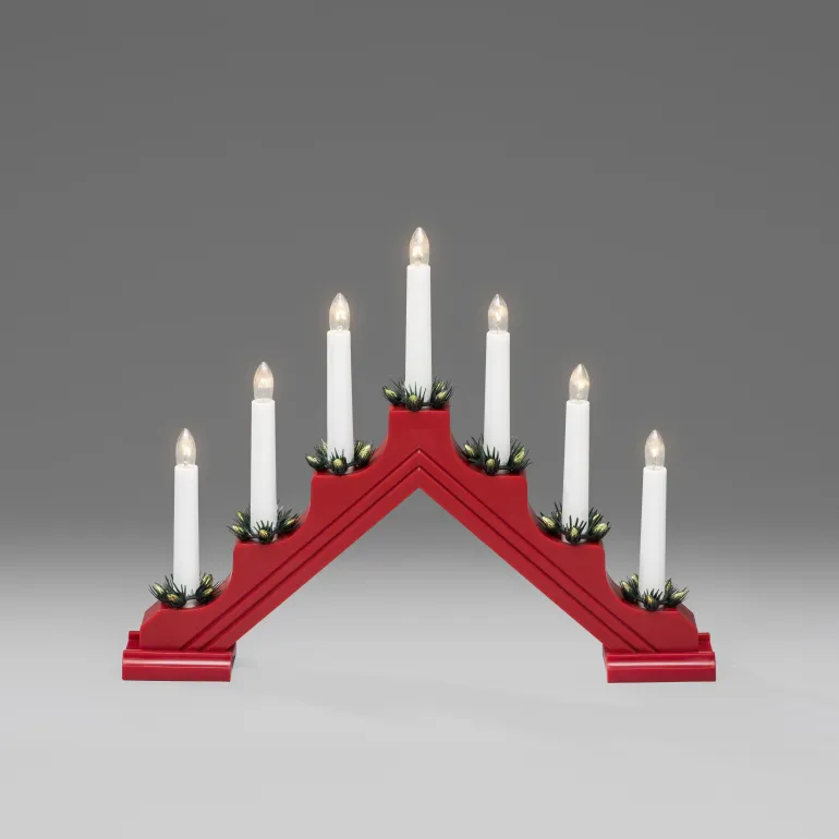 Konstsmide 2310-510 on sähkökynttelikkö klassisella muotoilulla. 7 kynttilää, materiaali muovi ja koristerenkaat (mänty). Väri punainen.
