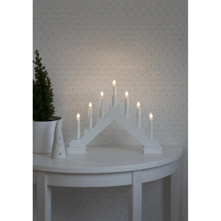 Sähkökynttelikkö mattalakattua puuta, joka toimii 6 x AA-paristolla ja siinä on 6 tunnin ajastin. Sähkökynttelikön kokonaiskorkeus on 28 cm ja se on helppo sijoittaa paikkoihin, joissa sähkörasia on hankalasti tavoiteltavissa. Valolähteet eivät ole vaihdettavissa.