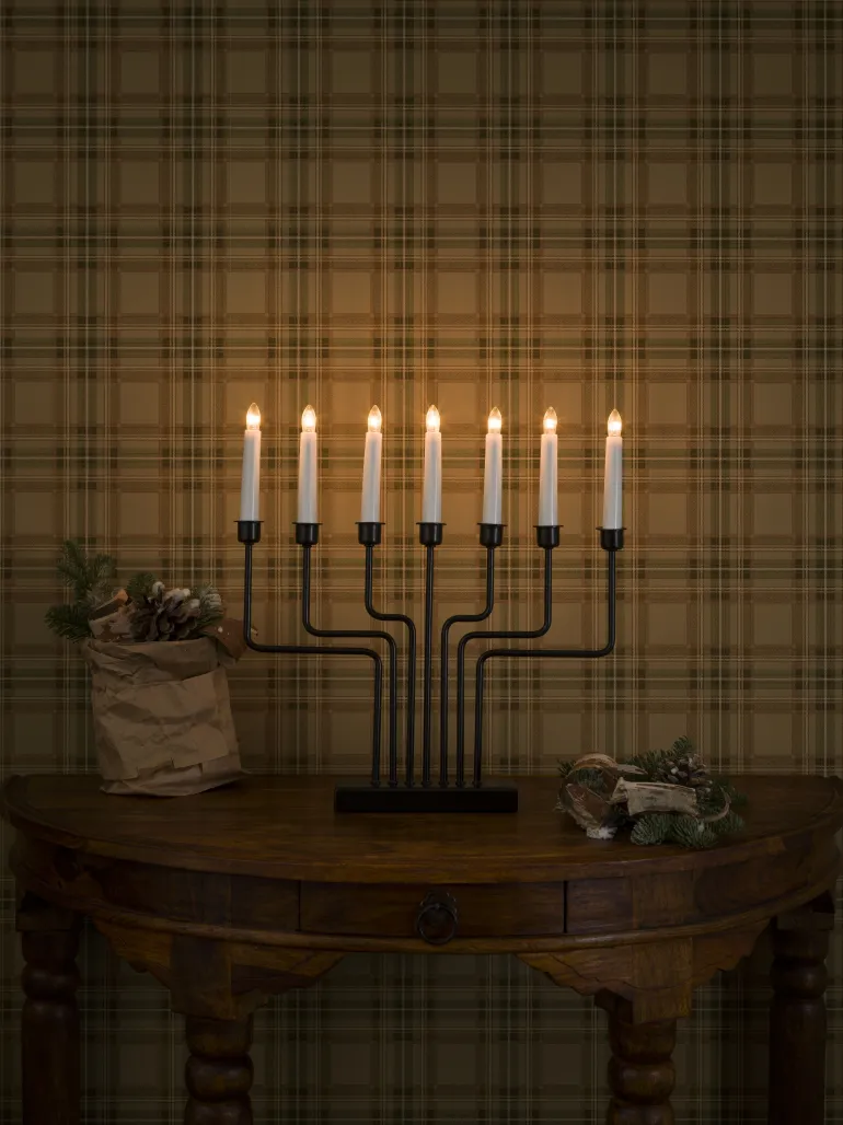 Konstsmide 3528-710TR on sähkökynttelikkö 7 kynttilällä. Materiaalina metalli, ja muotoilultaan selkeän yksinkertainen joka sopii moniin erilaisiin sistustuksiin. Väri musta.