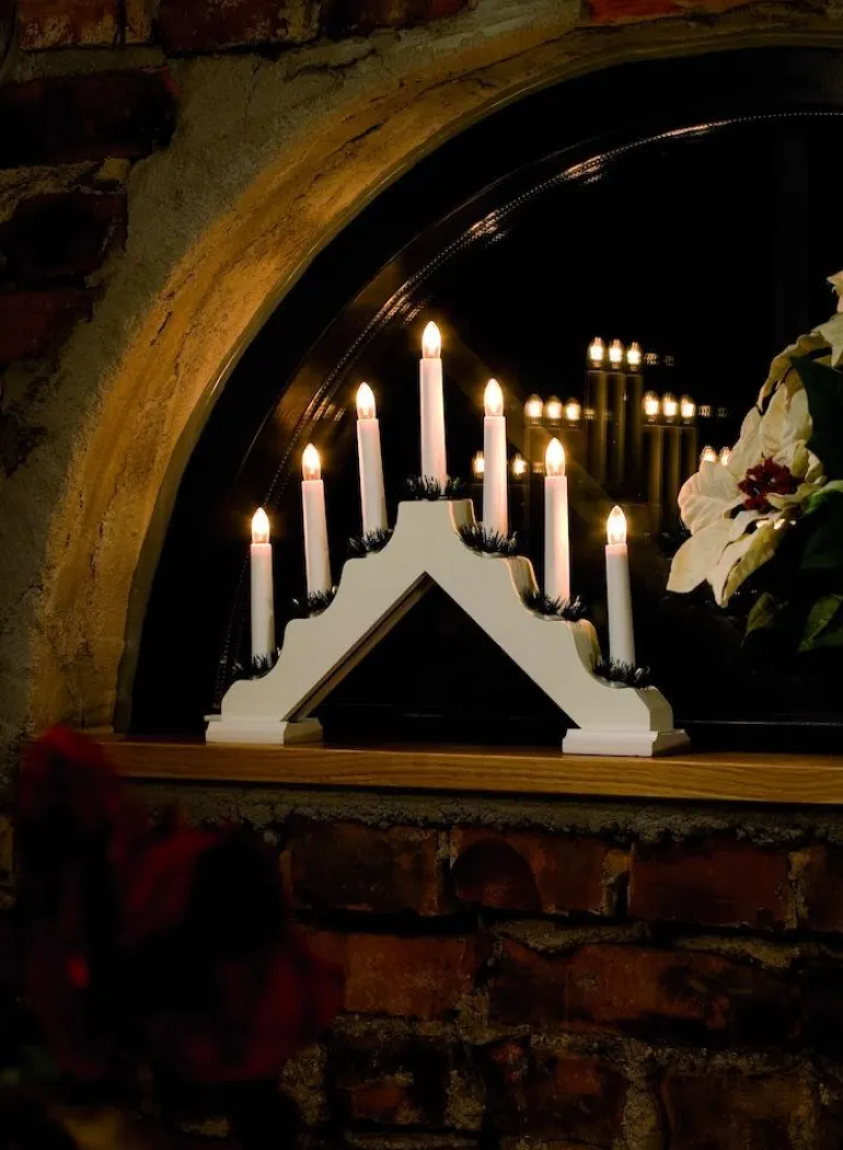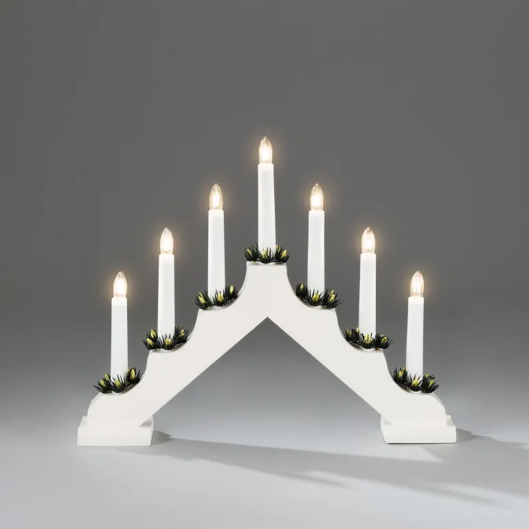 Klassinen valkoiseksi maalattu puinen sähkökynttelikkö, jossa on 7 valopistettä. Sähkökynttelikön kirkkaus on 6 luumenia, ja se on varustettu valkoisella 170 cm:n pituisella johdolla, jossa on kytkin.