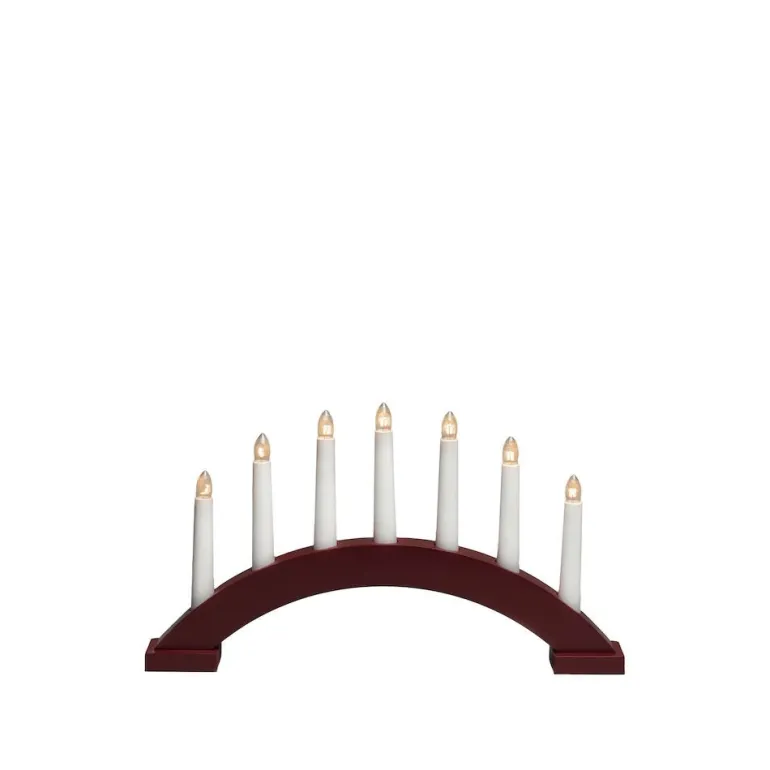 Tummanpunainen puinen sähkökynttelikkö, jossa on 7 valopistettä. Sähkökynttelikön valovirta on 8 luumenia, ja se on varustettu valkoisella 170 cm:n pituisella johdolla, jossa on kytkin.