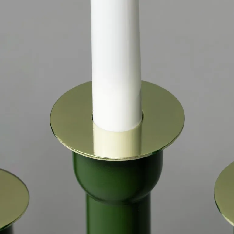 Konstsmide 3978-950 on puinen sähkökynttelikkö 6 kynttilällä. Vihreä, koristerenkaat messingistä. 230V/IP20.