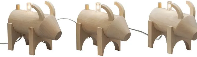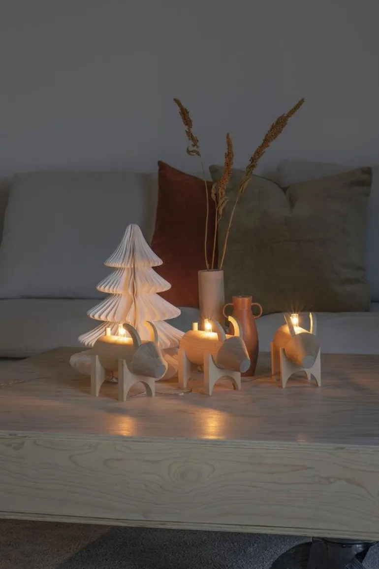 Kolme luonnonväristä jouluvuohta. Ne ovat kiinnitettynä toisiinsa läpinäkyvällä kaapelilla ja jokaisen vuohen välillä on 32 cm. Käyttö muuntajan kanssa. Valonlähteet voidaan vaihtaa tarvittaessa.