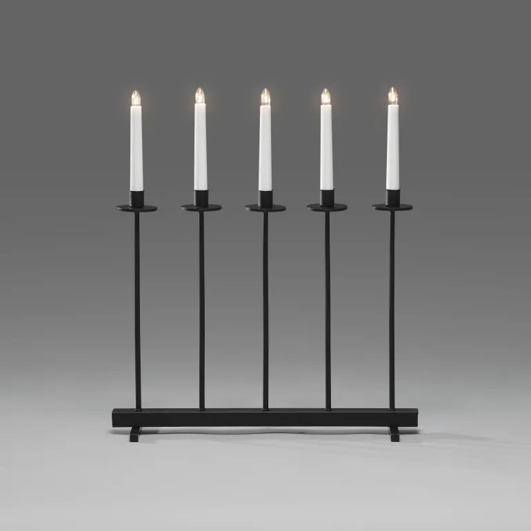 Konstsmide 3558-710TR on musta sähkökynttelikkö 5 kynttilällä. Metallia, mustalla johdolla jossa kytkin.