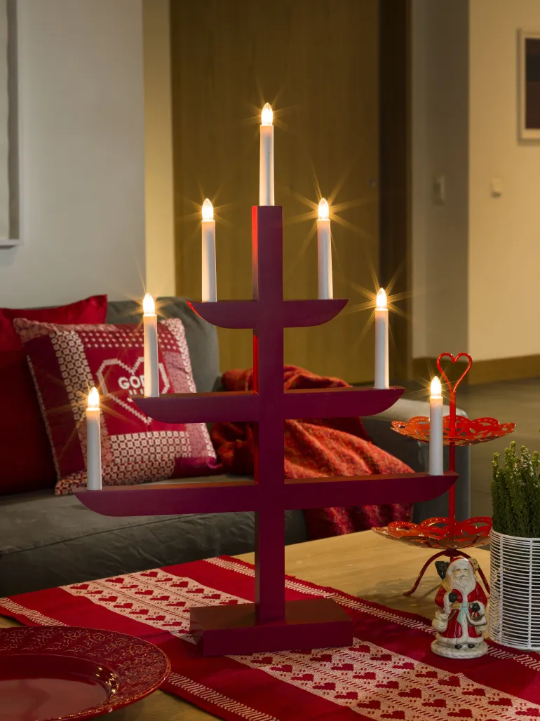 Konstsmide 3583-510 on puinen sähkökynttelikkö 7 kynttilällä. Korkeus 65 cm ja väri punainen. 230 V.