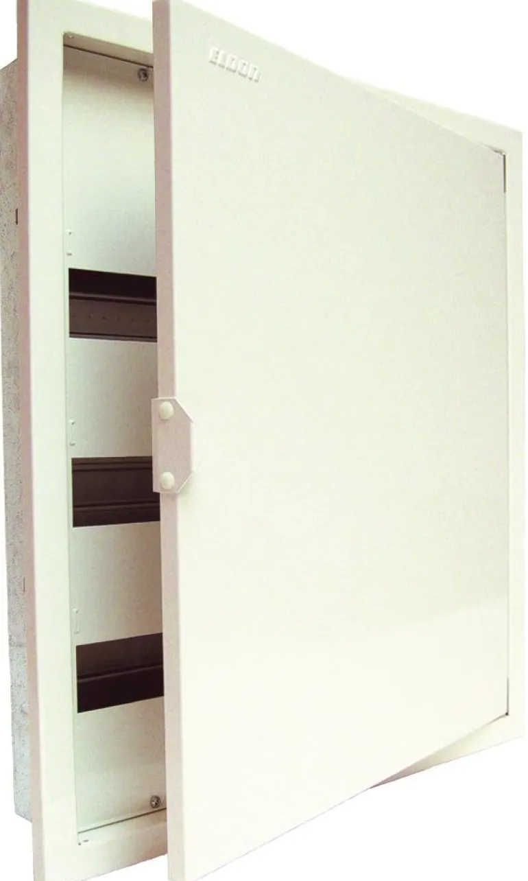 Upotettava standardikotelo tyyppi DBI, joka koostuu syvennysrungosta luukulla ja moduulin alustalla sekä etulevystä DIN-aukoilla. Syvennysrunko ja etupaneeli valkoiseksi maalattua metallilevyä (RAL 9010).