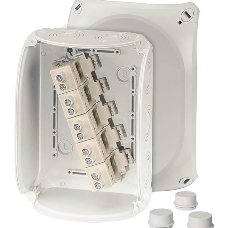 Hensel Enycase DK -kytkentärasia liittimellä, integroidut elastiset kalvot, jotka voidaan helposti irrottaa ennen kaapelin asettamista kaapeliliitosten kautta. Kaapelin läpivienti pohjassa mahdollistaa kansiruuvien tiivistämisen ilman lisävarusteita. Sisältää kiinnityshihnat ja ulkoseinäkiinnittimet.