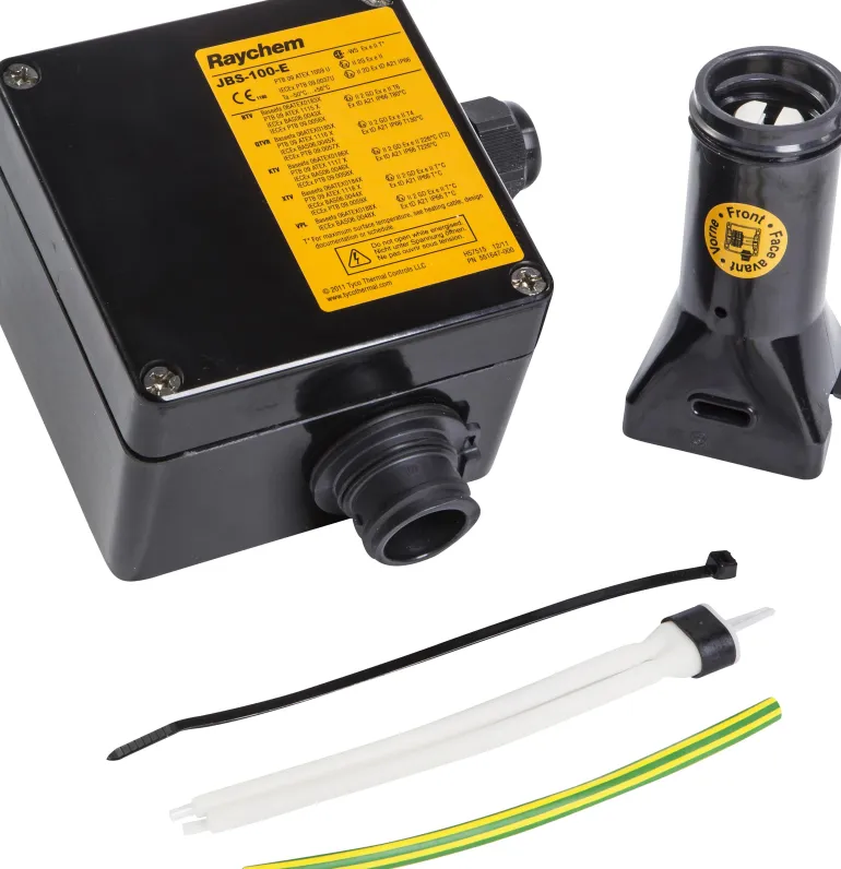 Raychem JBS-100-E on putkeen asennettava kytkentärasia lämmityskaapelille. Hyväksytty käytettäväksi räjähdysvaarallisilla alueilla. Toimii sekä liitäntäsarjana että eristysläpivientinä. BTV-, QTV-, XTV-, KTV- ja VPL-kaapeleille.