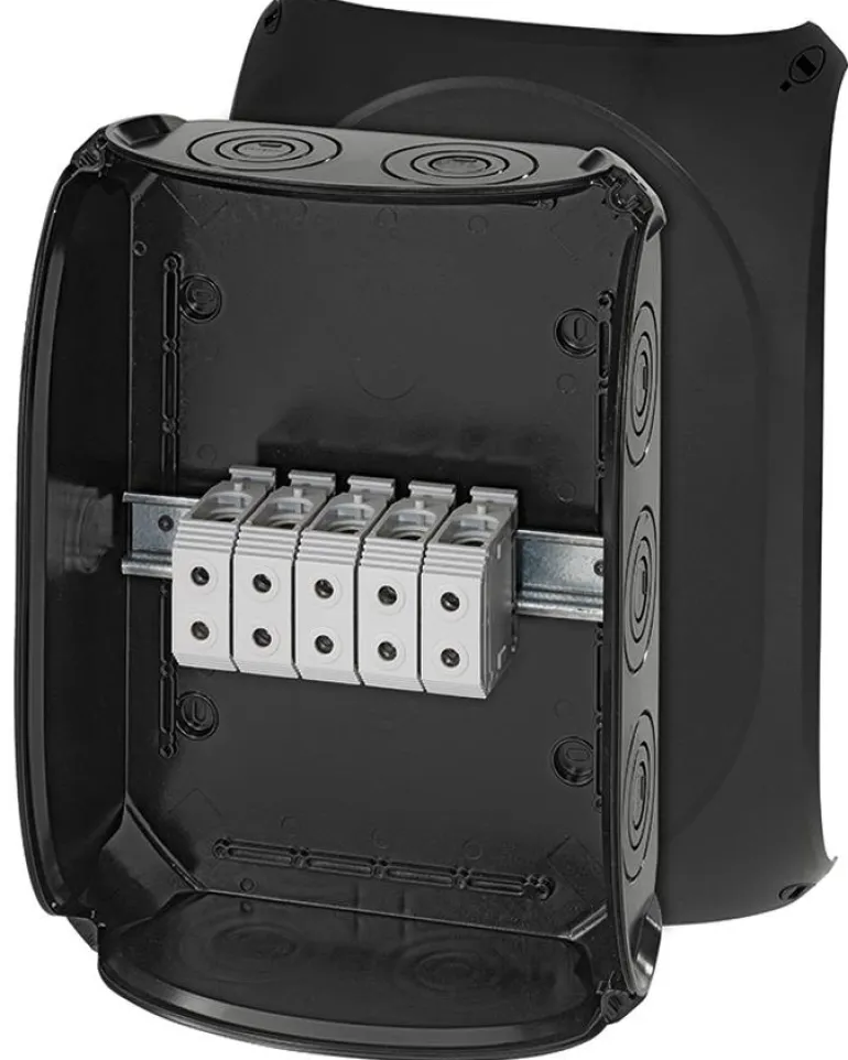 Kytkentärasia lasikuituvahvistettua polykarbonaattia vaativiin ympäristöihin asennettavaksi. Nimellisjännite 690V. Hyvä UV-kestävyys. Laatikossa on 5-napainen liitin kaapeleille Toimitetaan läpivientiaukkoineen ja aukoilla erikseen tilattaville ruuviliittimille. Laatikot ovat Länsförsäkringarin suosittelemia käytettäväksi maatalouskäyttöön.Kansissa on pikalukitus ja näkyvä lukitusasento. Monivaiheiset läpivientiaukot erikokoisille kaapelikiinnikkeilleja myös kaapeliläpivienti pohjassa Kaikki liittimet kahdella kiinnikkeellä napaa kohden, jotka voidaan asettaa eri liitinasentoihin ja eri kiinnitysvaihtoehdoilla. Korotetut liittimet, joissa on runsaasti tilaa liitännöille sekä kyky liittää eri johdinkokoja ja kaapelityyppejä. Laatikon mukana toimitetaan aina ulommat liittimet